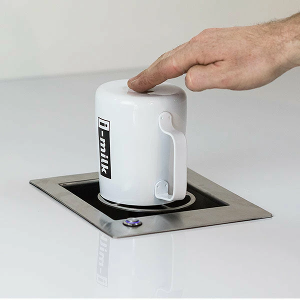 Then i-rinse is retrofittable into your bench and can be placed in an existing hole from a previous milk pitcher rinser. Simply place the i-rinse on your bench and attach it to the mains water supply, the power supply, and your drain. As well as being easy to install, the i-rinse can be cleaned by simply lifting off the jug rest and cleaning the inside of the rinser before placing the jug rest back on.