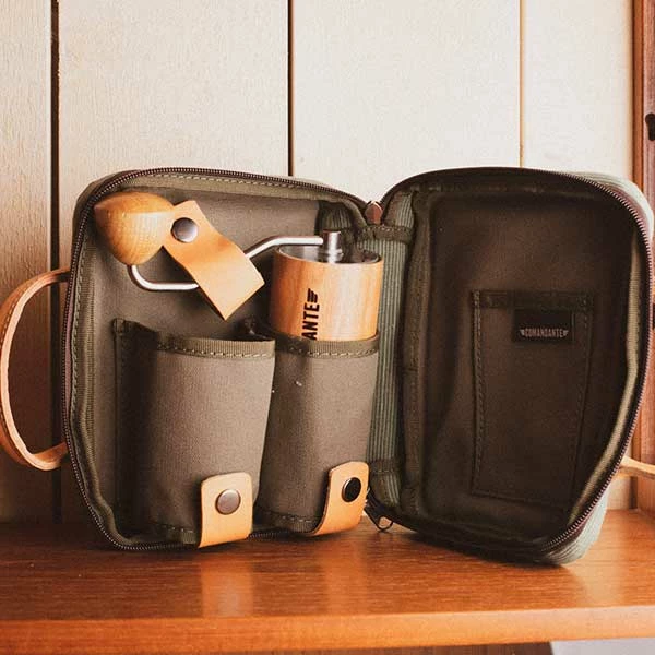 The C40 bag features multiple compartments for storing your accessories like a spoon, cleaning brushes, and extra Comandante bean jars (not included), with plenty of space still to store your grinder with the crank mounted.