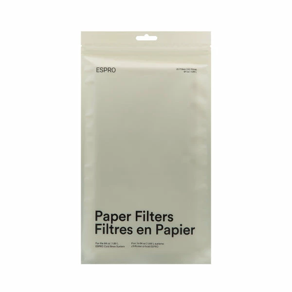 The Replacement compostable paper filters for the Espro CB1 Cold Brew Kit. The Espro CB1 makes 1.4L of cold brew coffee that is a delicious, smooth cold brew concentrate and in as little as 24hrs you can enjoy it over ice, with milk, or just by itself for a stronger coffee beverage.