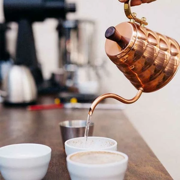 Using your Hario Copper Buono Kettle is simple, measure your required water for your pour over coffee and place it in the kettle. Then place the kettle on your stove top, fire or other heating device heating to your required temperature. Then take the kettle off and begin your brewing process!