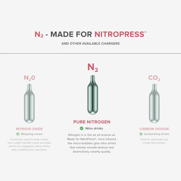 Forget about the bulkier, more expensive to run cold brew condenser units and look no further than the Original NitroPress. Equipped to use both N2, N2O and CO2 bulbs. It is the N2 bulbs, a flavourless gas, however that gives the greatest effect with the smallest bubbles. Guaranteed to deliver an exciting looking drink that’s a delicious nitro infused cold brew coffee.