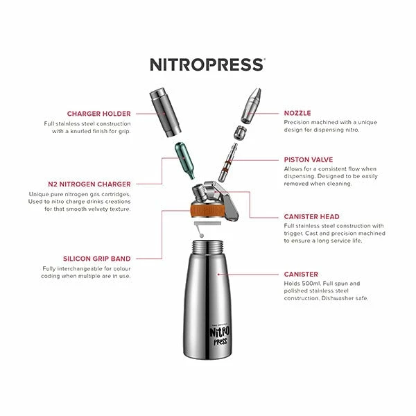 The Original NitroPress is a specifically designed whipping siphon that dispenses Nitrogen infused cold brew coffee with the cascading effect that’s typical of the perfect nitro cold brew. Simple to use, easy to clean, affordable and compact make the NitroPress the ideal solution to enjoying nitro cold brew coffee. In the convenience of your own home or serve it up quick in a cafe.