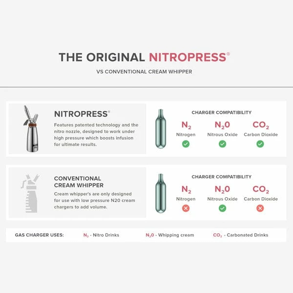 The unique patented nozzle of the NitroPress is what differentiates it from your everyday whipping siphons. Fashioned to produce are greater cavitation effect within the liquid results in a smoother and creamy mouthfeel with bubbles that are smaller and more consistently mixed through the beverage. You’ll see and taste the difference in the draft-cascading head as opposed to the stiff, thick foams produced by conventional methods.