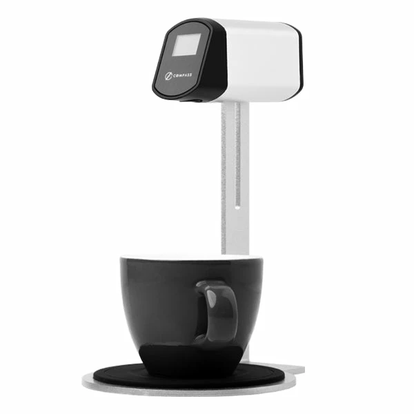 The Nucleus Compass is a hands-free thermometer that allows you to take the temperature of your coffee from a distance, without ever dipping the apparatus into your cup. Thanks to its infrared temperature sensor, you can get accurate readings quickly as the Nucleus Compass hovers over your coffee. It can also be set up on a stand for a completely hands-free operation or be used as a handheld device. Perfect for assessing coffee quality during cuppings and competitions.