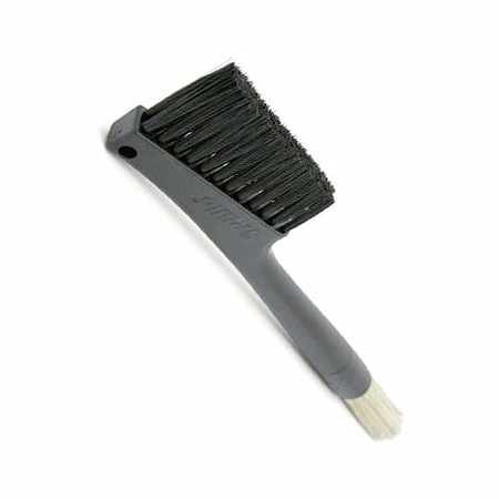 Hanger hole allows for storage out of the way. Low profile head is designed to reach under NSF height approved espresso machines. Ergonomic handle keeps your hand in a comfortable natural position. Natural food-grade bristles excel at collecting large and small grinds alike. Three rows of stiff nylon bristles provide plenty of sweep for your counters.