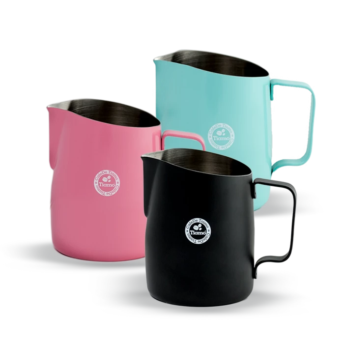 The stainless steel body is durable and is nickel coated with either matte black, pink, or teal blue to fit into any style kitchen or cafe. Whether you’re a veteran or newcomer to latte art, this milk jug offers control, style, and years of use.